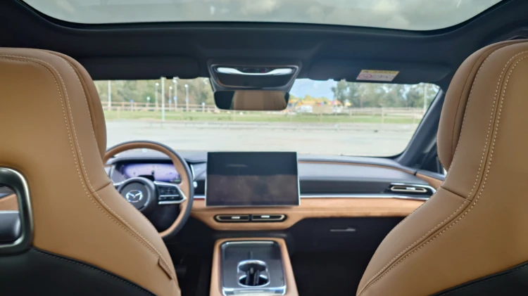 Mazda 6E är en trevlig elbil, kort och gott. Interiören (Takumi Plus) kom med brunt nappaläder och mockaliknande detaljer. Snyggt och gav en lyxig känsla. Medpassageraren förflyttades däremot till 70-talet. Panoramataket gav en luftigare känsla än vad det faktiskt är, något som kan uppskattas i en sedan.