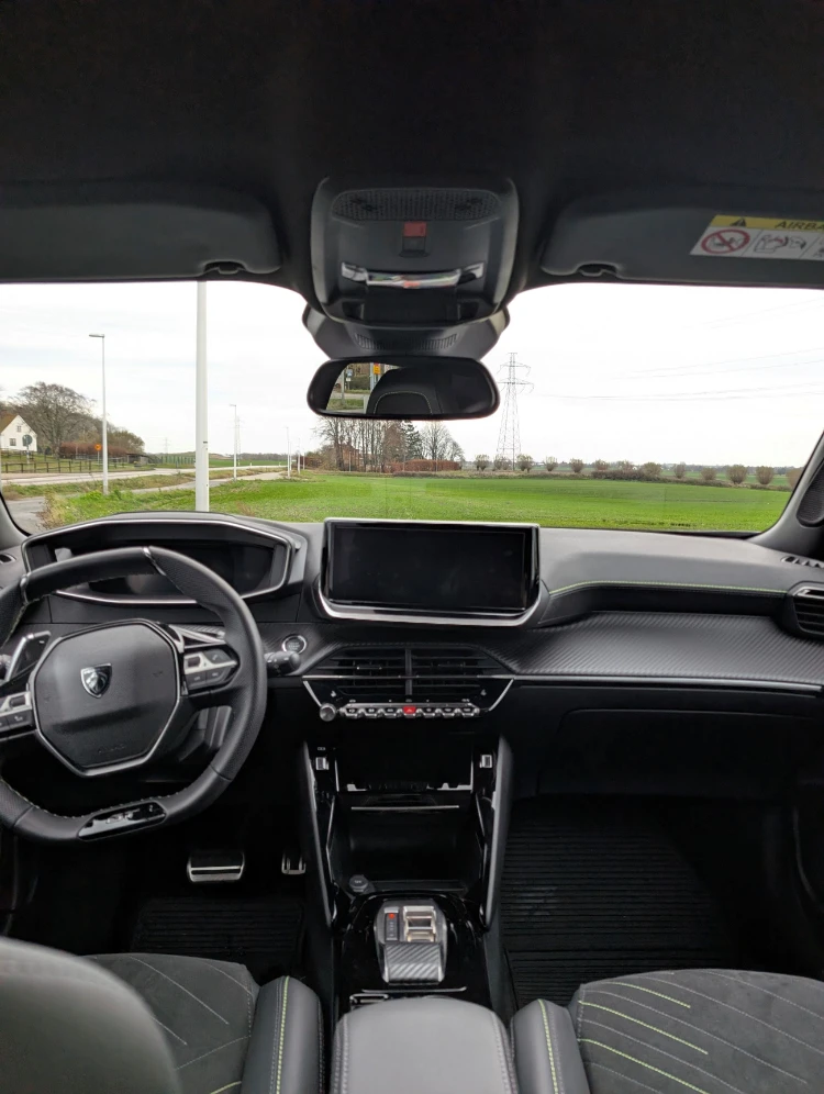Förardisplayen sitter placerad ovanför den kompakta ratten och skapar en 3D känsla. Modellen kommer som bensin,hybrid eller eldriven. Komfortnivån är hög för klassen och bagageutrymmet (434 l) har förvånande god rymd trots bilens kompakta mått.